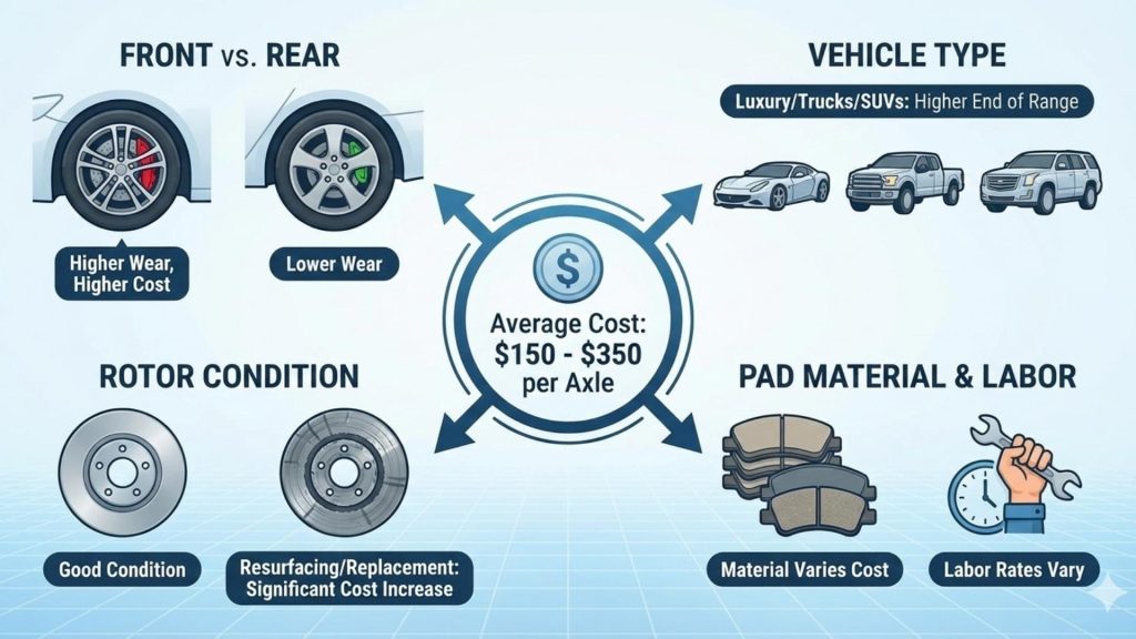 Front brake pads are typically more expensive than rear pads because they handle more braking force and wear faster. Luxury vehicles, trucks, and SUVs often fall at the higher end of the price range.
