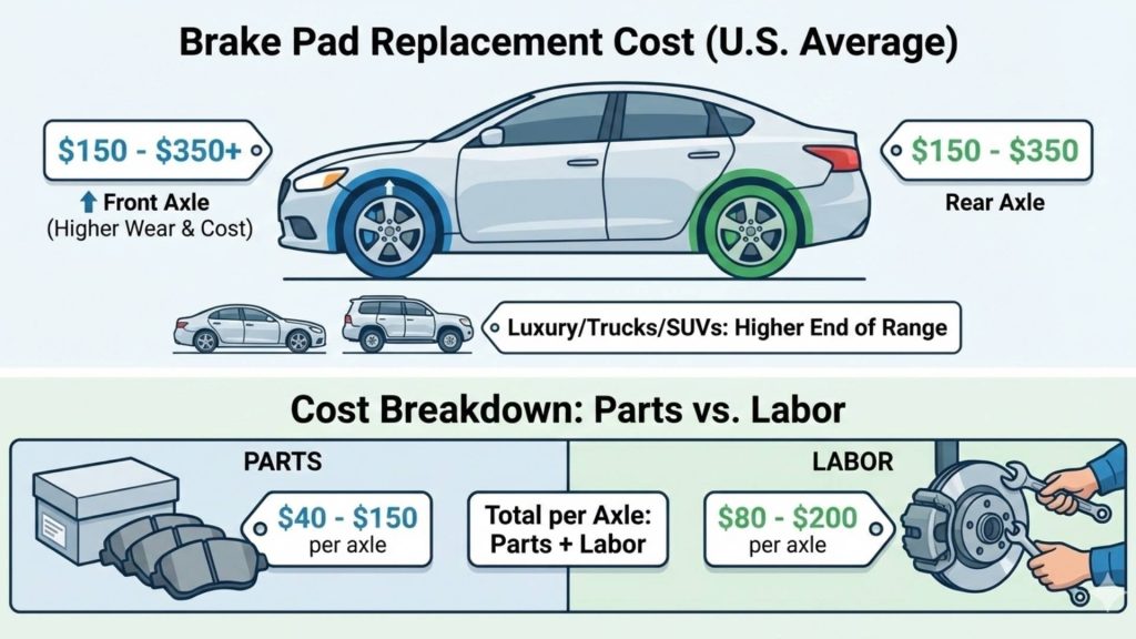 On average, brake pad replacement in the U.S. costs between $150 and $350 per axle. This range includes parts and labor for standard passenger vehicles.