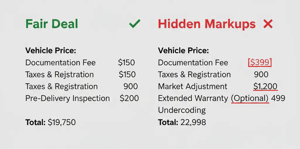 Avoid dealer markups by learning how to spot hidden fees before you commit to a used car purchase. Buying a used car should feel simple. You find a solid model, you check its condition, and you pay a fair price. The part that ruins the experience is the slow creep of dealer markups. They can show up in the sticker price, hide in fees, or even sneak into financing.