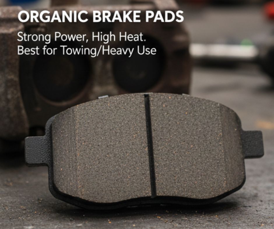Organic pads provide smooth, quiet braking and are generally affordable. They are gentle on rotors but wear faster and struggle with heat buildup.