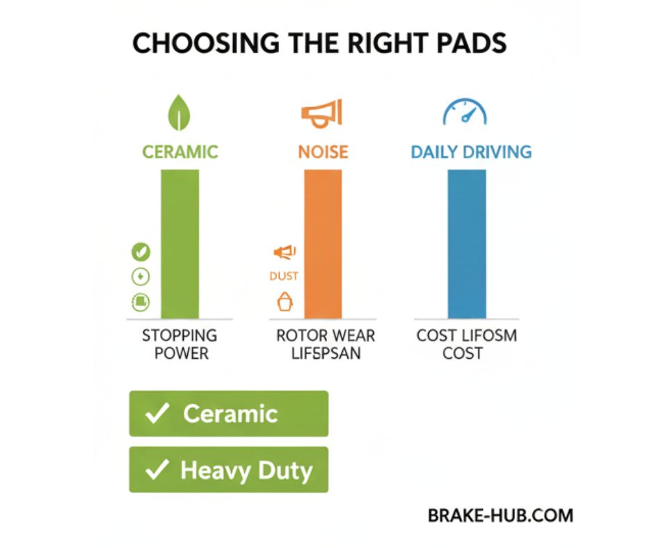 Ceramic pads are ideal for everyday driving. Semi-metallic pads perform better under heavy use. Organic pads remain suitable for light-duty applications.