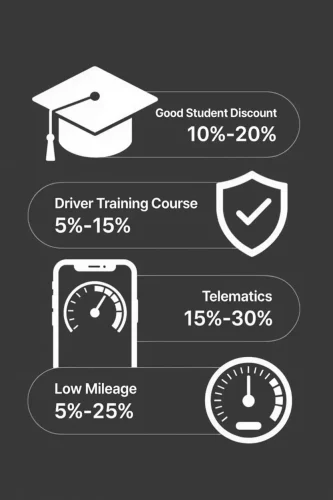 Good student discount: if you’re in school and maintaining decent grades this is usually 8 to 15 percent depending on the insurer. You typically need to show proof of GPA every year to keep it.
