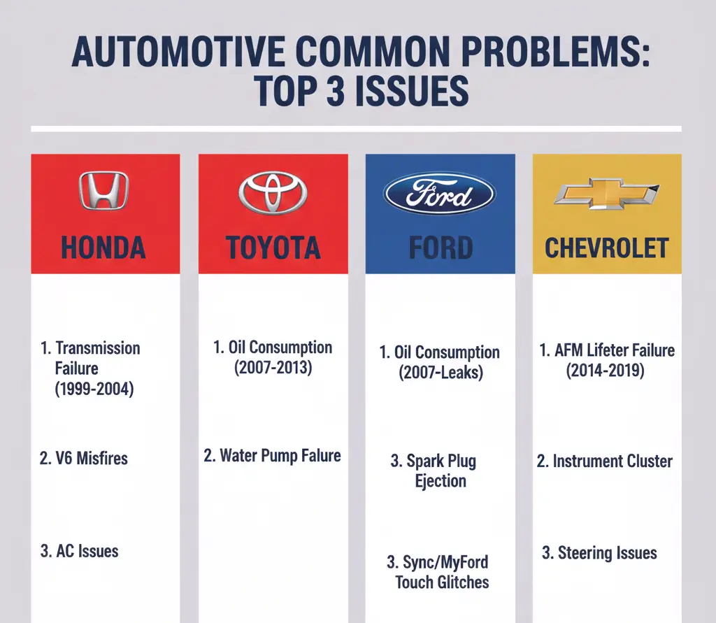 Common used car problems by brand: honda, toyota, ford, chevrolet