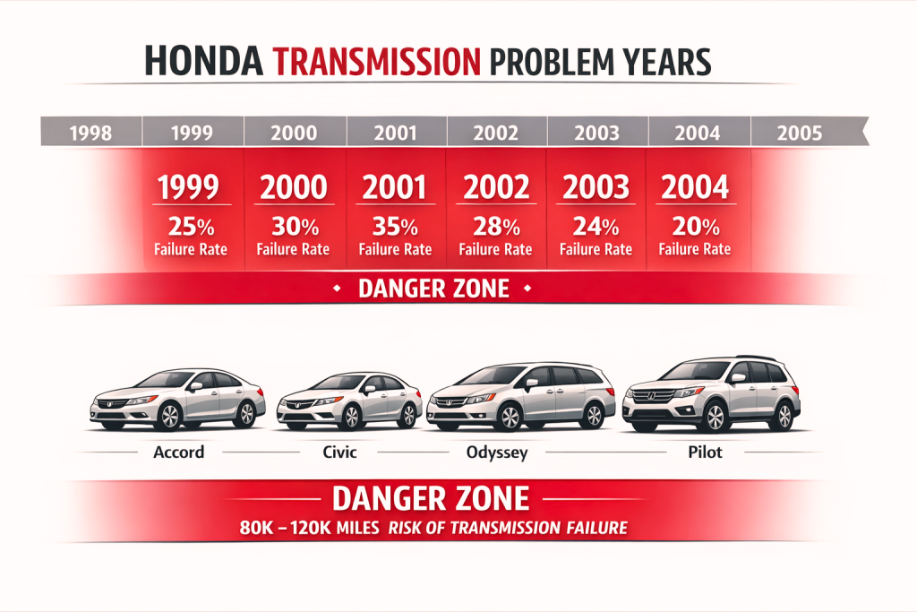 I’ve always respected Honda for reliability but they had a dark period between 1999 and 2004. The automatic transmissions in Accords, Civics, Odysseys, and Pilots from these years fail at alarming rates. We’re talking complete transmission failure between 80,000 and 120,000 miles in many cases.