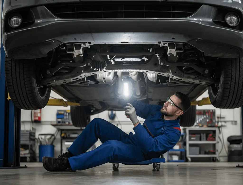 Getting under the vehicle reveals critical information about frame condition, exhaust system, and suspension components. I carry a mechanics creeper and use it whenever possible to thoroughly inspect the undercarriage.