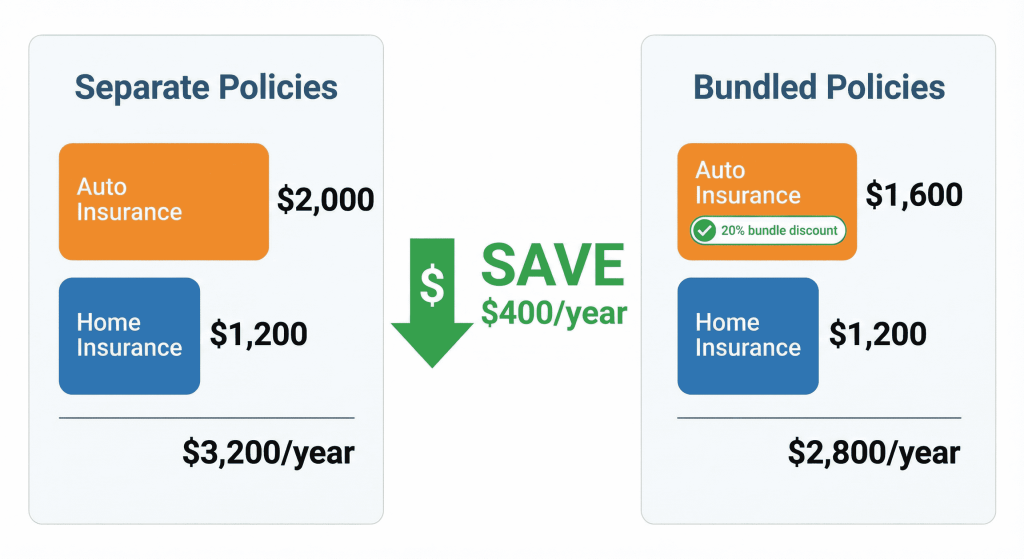 Looking at a typical scenario with $2,000 auto insurance and $1,200 home insurance purchased separately, you’d pay $3,200 total annually. Bundle them together and the auto portion drops to $1,600 with a 20% discount while home insurance stays at $1,200. Your new total is $2,800, saving you $400 per year.
