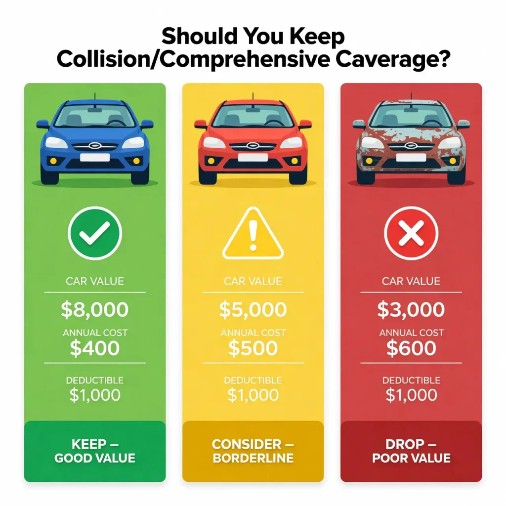 My rule of thumb is if your car is worth less than 10 times your annual collision and comprehensive premium, consider dropping those coverages. Self-insure by putting the premium savings into a car replacement fund.