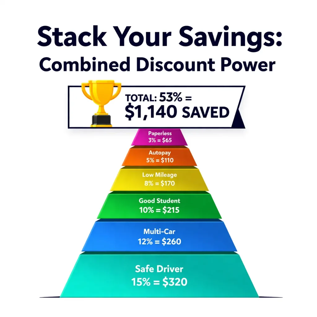 Each individual strategy might save 5% or 10% but stacking multiple tactics creates substantial savings. Bundle your policies for 20% off. Raise your deductibles for another 15%. Add usage-based monitoring for 25% more. Claim safe driver, low mileage, and automatic payment discounts. Suddenly you’re paying 50% to 60% less than before.