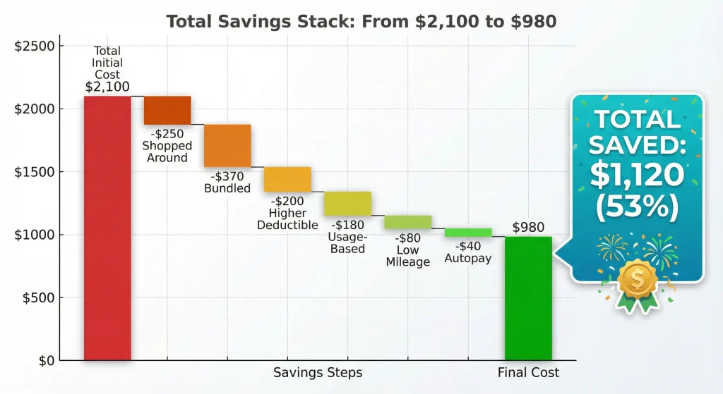 Total savings from $2,100 to $980 is $1,120 annually. That’s 53% off my original premium. Same coverage, same protection, just smarter about how I’m buying it. Over five years that’s $5,600 back in my pocket.