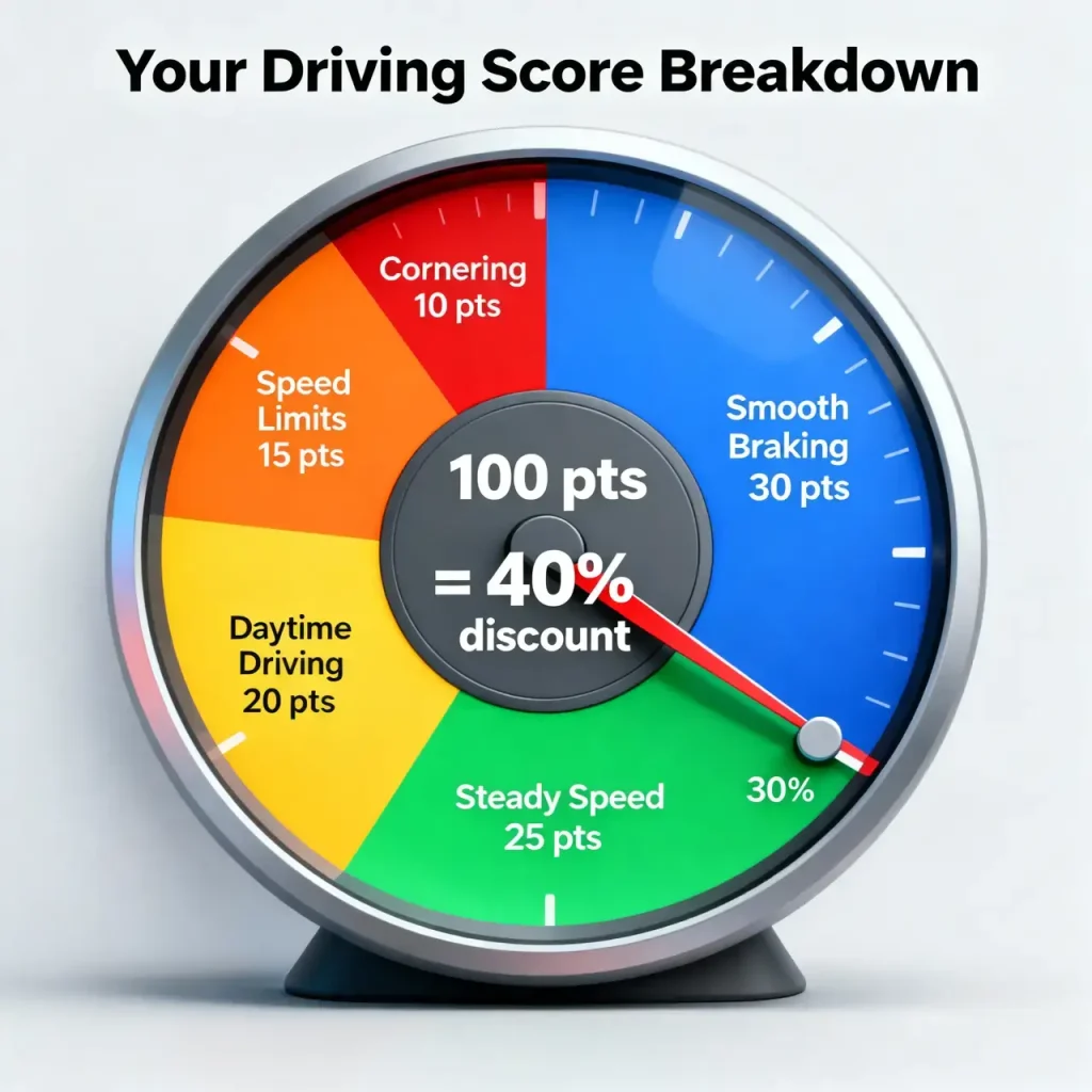 Your driving score gets calculated from multiple factors with different weights. Smooth braking events earn you 30 points toward your total score representing the biggest factor. Maintaining steady speeds without rapid acceleration adds 25 points. Driving during daytime hours between 6am and 10pm contributes 20 points. Staying within speed limits gives you 15 points. Minimal harsh cornering adds 10 points. Combined, a perfect score of 100 points earns you the maximum 40% discount.