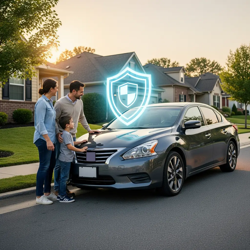 A dark blue SUV parked on a suburban street in front of modern homes, with a stylized shield graphic floating above the car showing icons related to money, growth, and scheduling.
